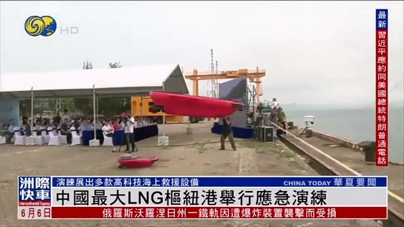 演練模擬了極端天氣下漁船失控與LNG運輸船發生嚴重碰撞的極端險情:液化天然氣(LNG)泄漏、船舶燃油外溢、3名船員落水生死未卜!警報拉響,“四級應急響應”立即啟動,海空立體救援力量火速集結。
