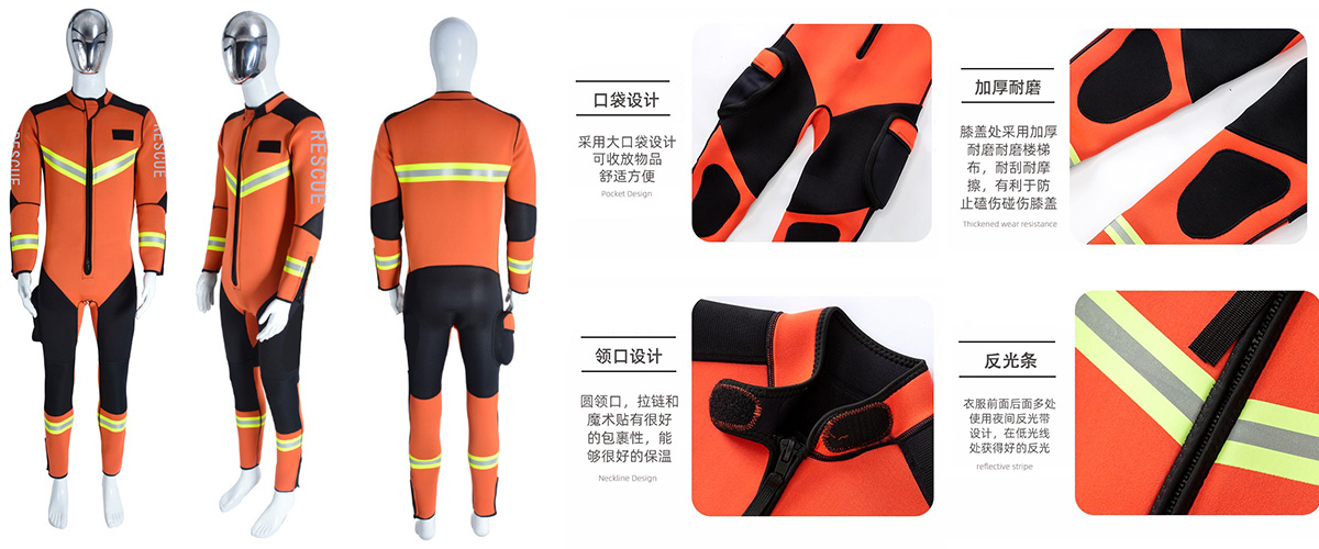 - ZJ038-B濕式救援服:采用3mm鈦涂層氯丁橡膠,極致柔韌,活動(dòng)自如。雖為濕式設(shè)計(jì),但通過特殊材質(zhì)和工藝,確保保暖、靈活、耐磨三者平衡,尤其適合需要大量游泳或高強(qiáng)度活動(dòng)的救援場景。