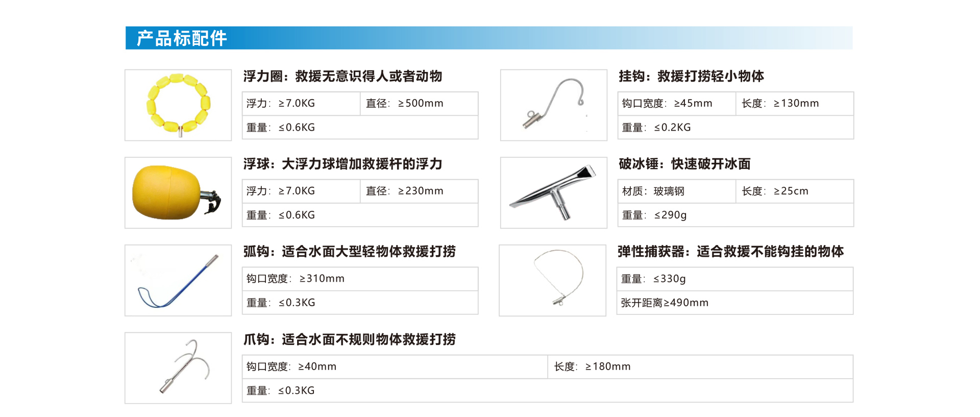 8、D形扣:用于從水里捕撈或救回一定的重物,不銹鋼材質(zhì)、鉗口寬≥7cm;