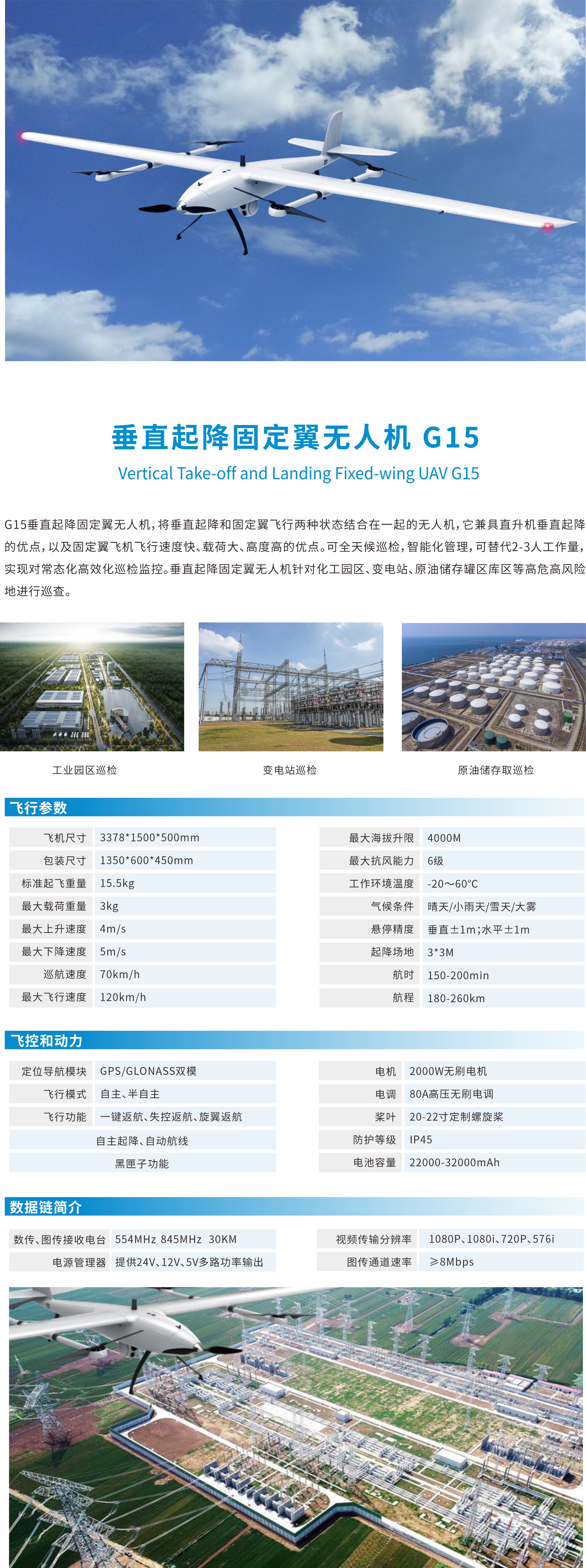 G15垂直起降固定翼無人機,將垂直起降和固定翼飛行兩種狀態結合在一起的無人機,它兼具直升機垂直起降的優點,以及固定翼飛機飛行速度快、載荷大、高度高的優點。可全天候巡檢,智能化管理,可替代2-3人工作量,實現對常態化高效化巡檢監控。垂直起隆固定翼無人機針對化工園區、變電站、原油儲存罐區庫區等高危高風險地進行巡查。